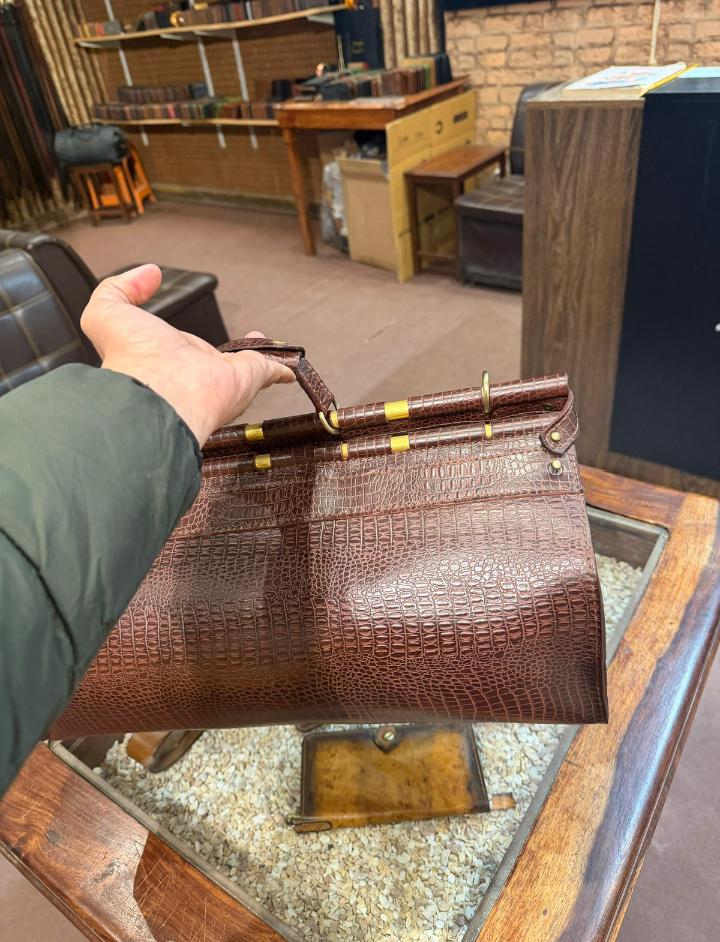 The bag features sturdy brass hardware, reinforced handles, and an adjustable detachable shoulder strap for comfortable carrying. High-quality stitching and fine finishing ensure long-lasting performance and durability.